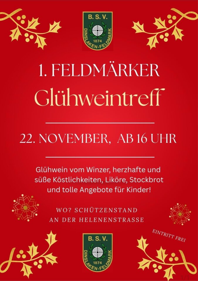Anstatt seines traditionellen Weihnachtsmarktes möchte der Bürgerschützenverein Dinslaken-Feldmark in diesem Jahr „neue Wege gehen“. Das schreibt der Vorstand in einer Mitteilung an die Redaktion. Zum ersten Mal laden die Schützen deswegen in diesem Jahr zum Glühweintreff ein. Los geht es am Samstag, 22. November, um 16 Uhr. „Glühwein vom Winzer, herzhafte und süße Köstlichkeiten, Liköre, Stockbrot und tolle Angebote für Kinder“ soll es laut Ankündigung geben. Stattfinden wird der „1. Feldmärker Glühweintreff“ am Schützenstand an der Helenenstraße. Der Eintritt zur Veranstaltung ist frei.